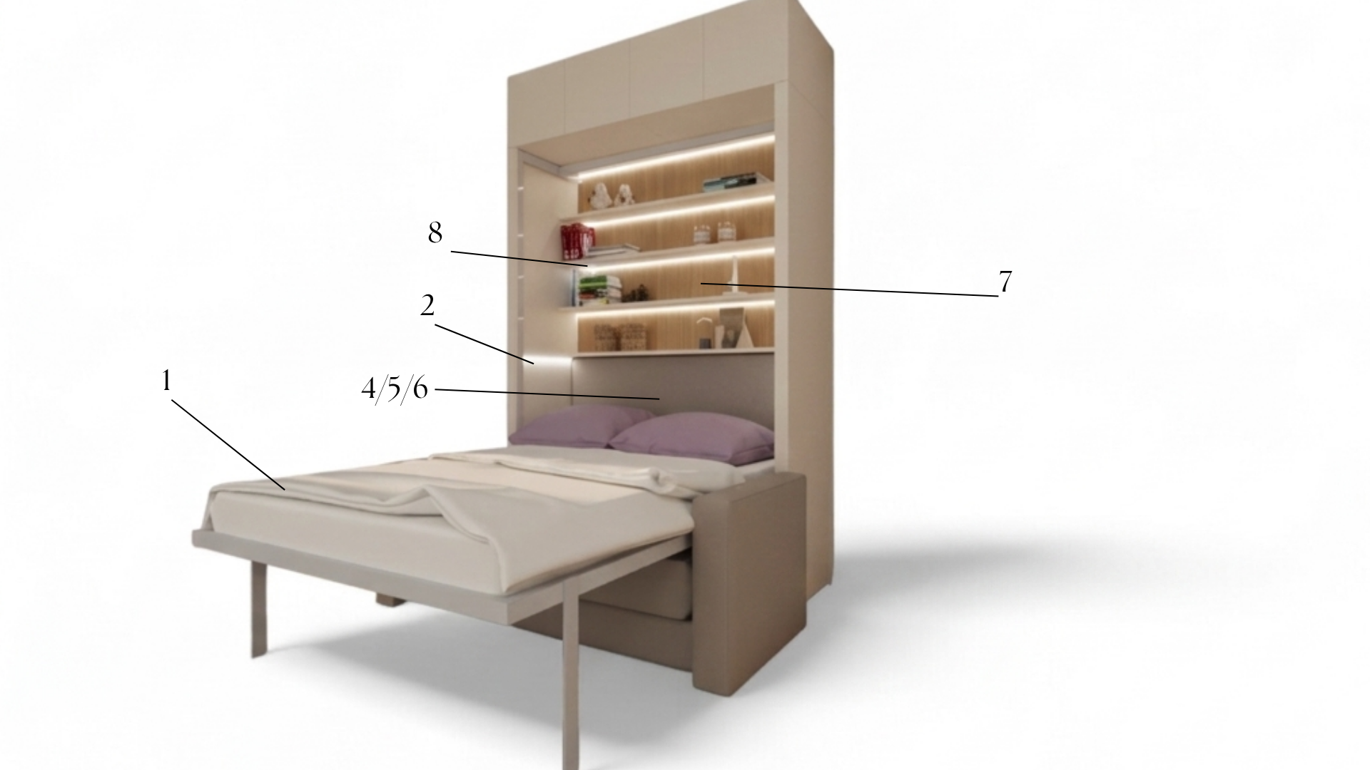b) Samostojeći zidni krevet (krevet se ne fiksira na zid ili plafon, već ima ploču za stabilizaciju ispred sebe).