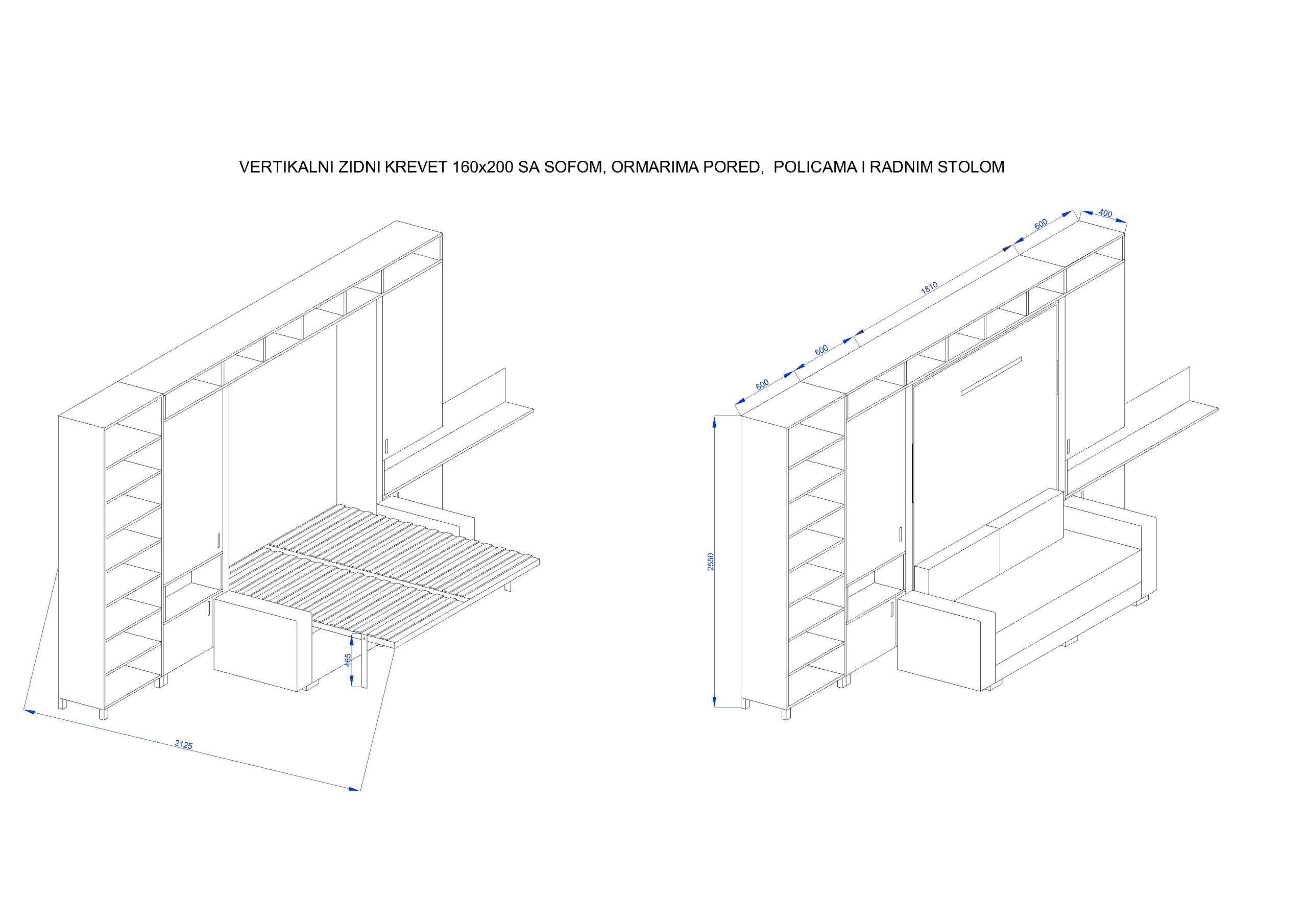 b) Samostojeći zidni krevet (krevet se ne fiksira na zid ili plafon, već ima ploču za stabilizaciju ispred sebe).