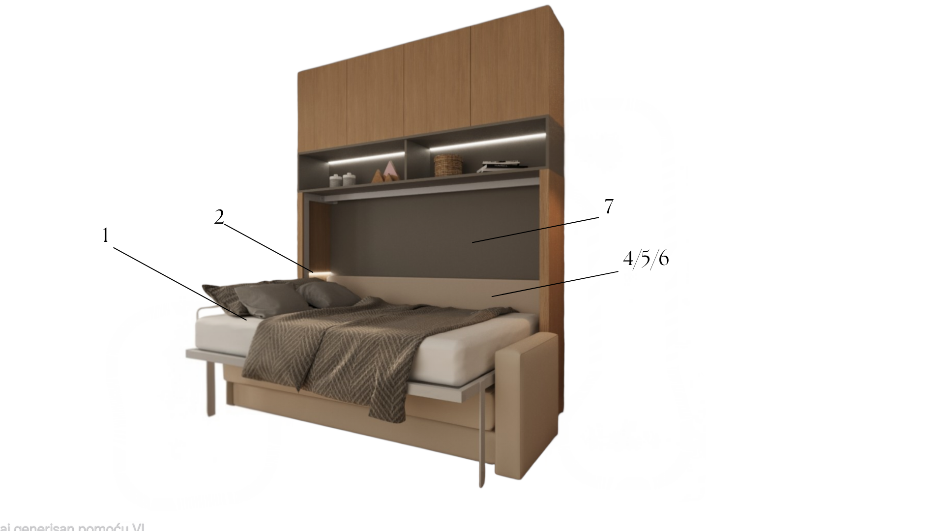 b) Samostojeći zidni krevet (krevet se ne fiksira na zid ili plafon, već ima ploču za stabilizaciju ispred sebe).