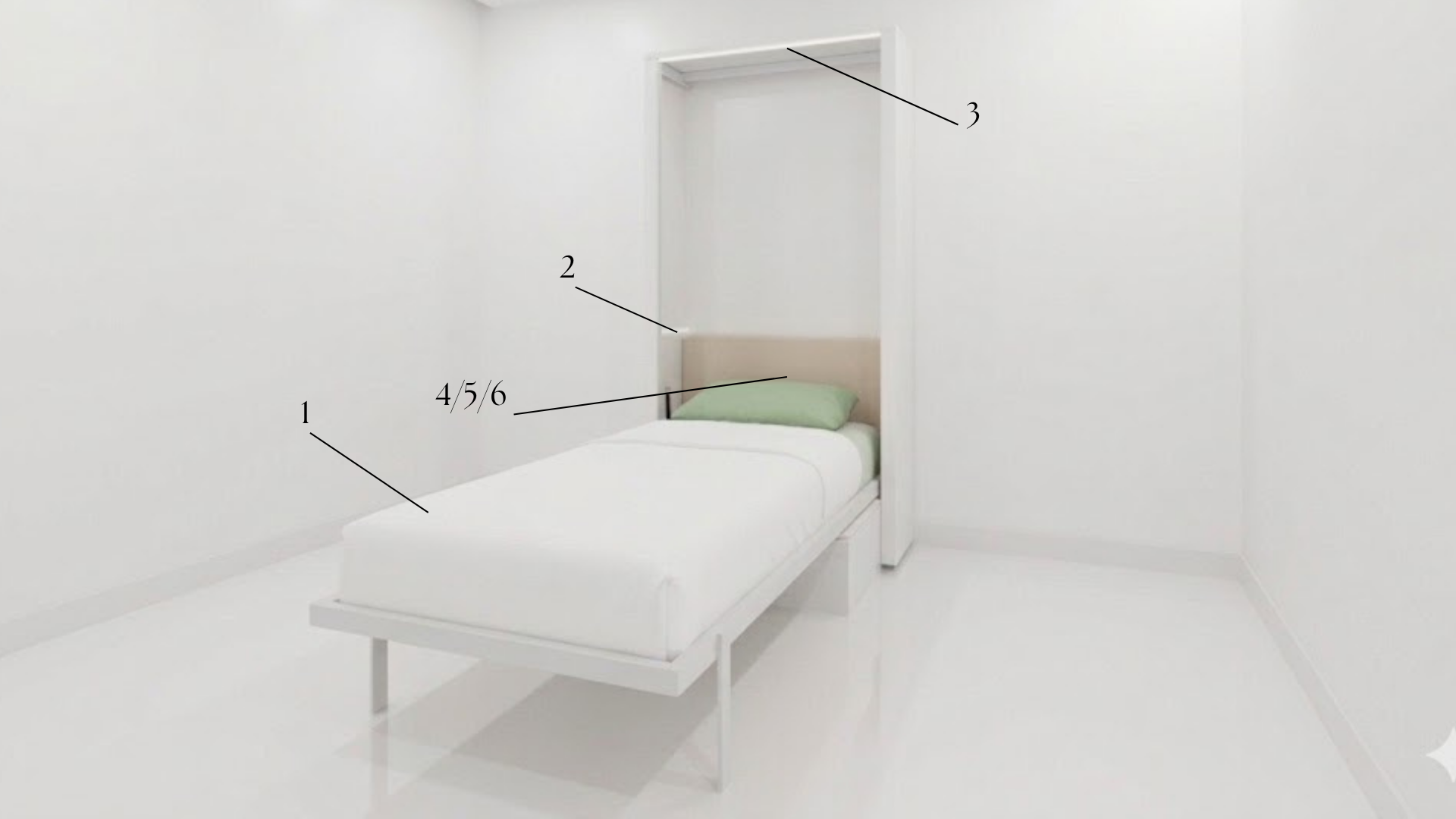 b) Samostojeći zidni krevet (krevet se ne fiksira na zid ili plafon, već ima ploču za stabilizaciju ispred sebe).