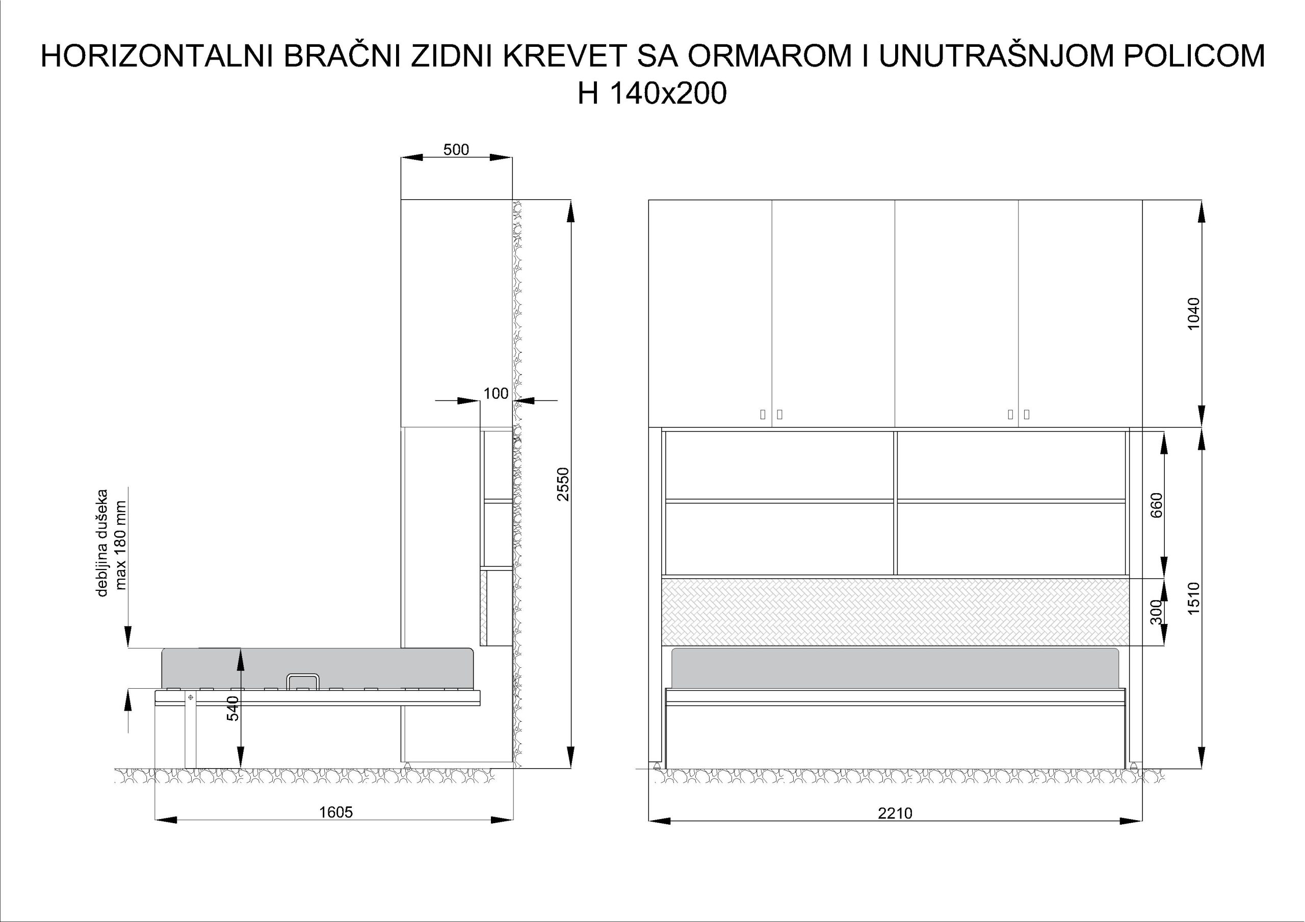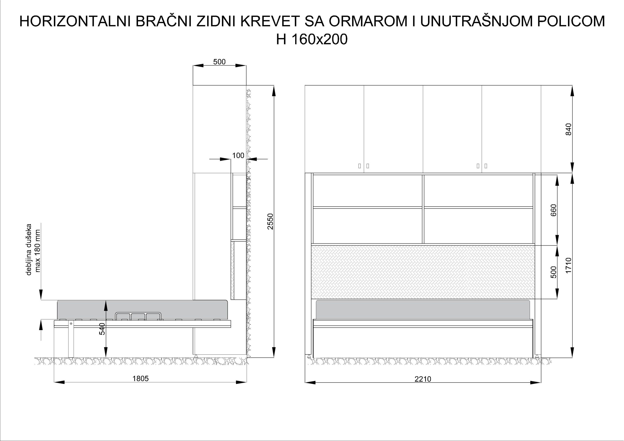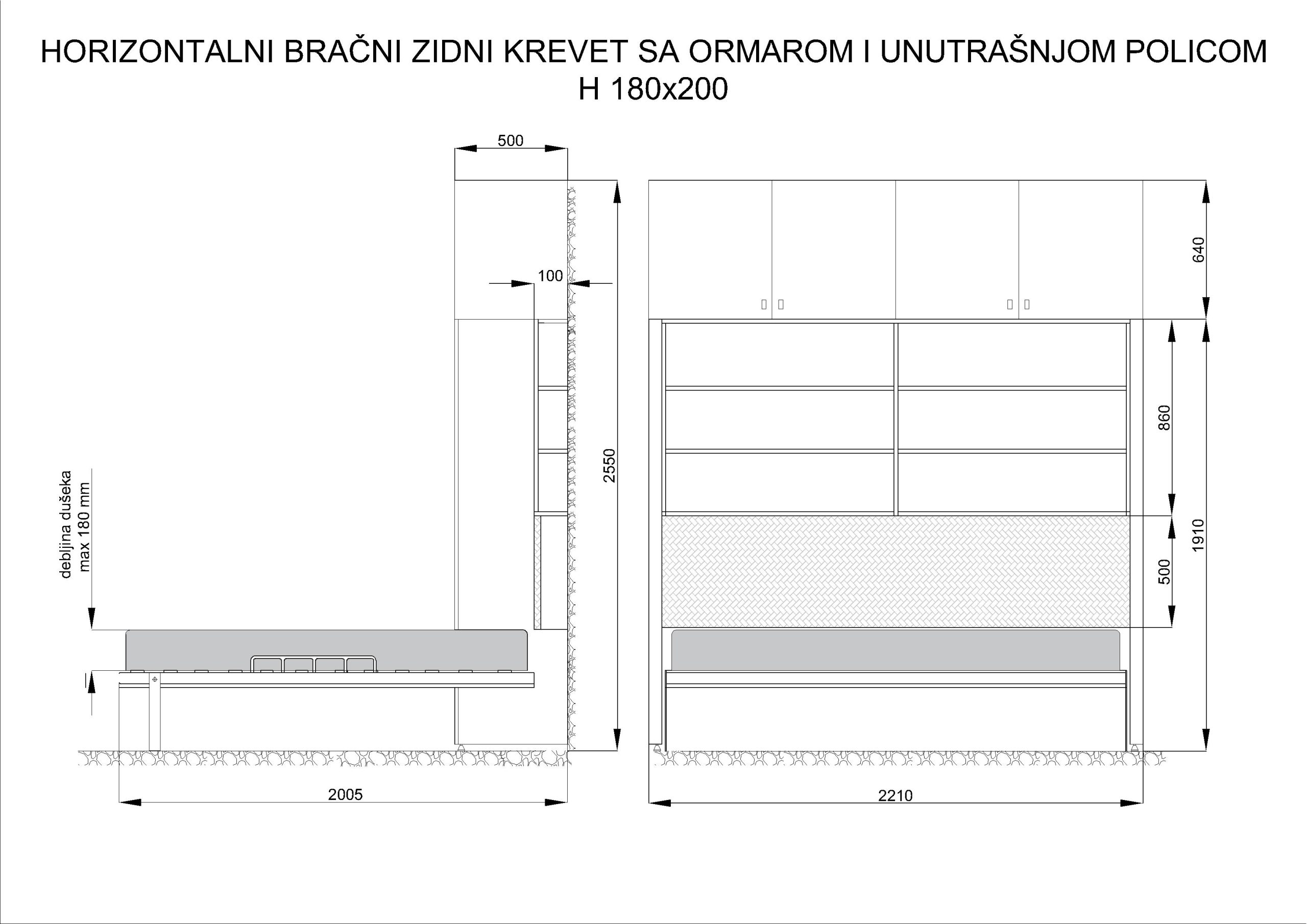 HORIZONTALNI BRAČNI ZIDNI KREVET SA ORMAROM DO PLAFONA I POLICOM UNUTAR KREVETA