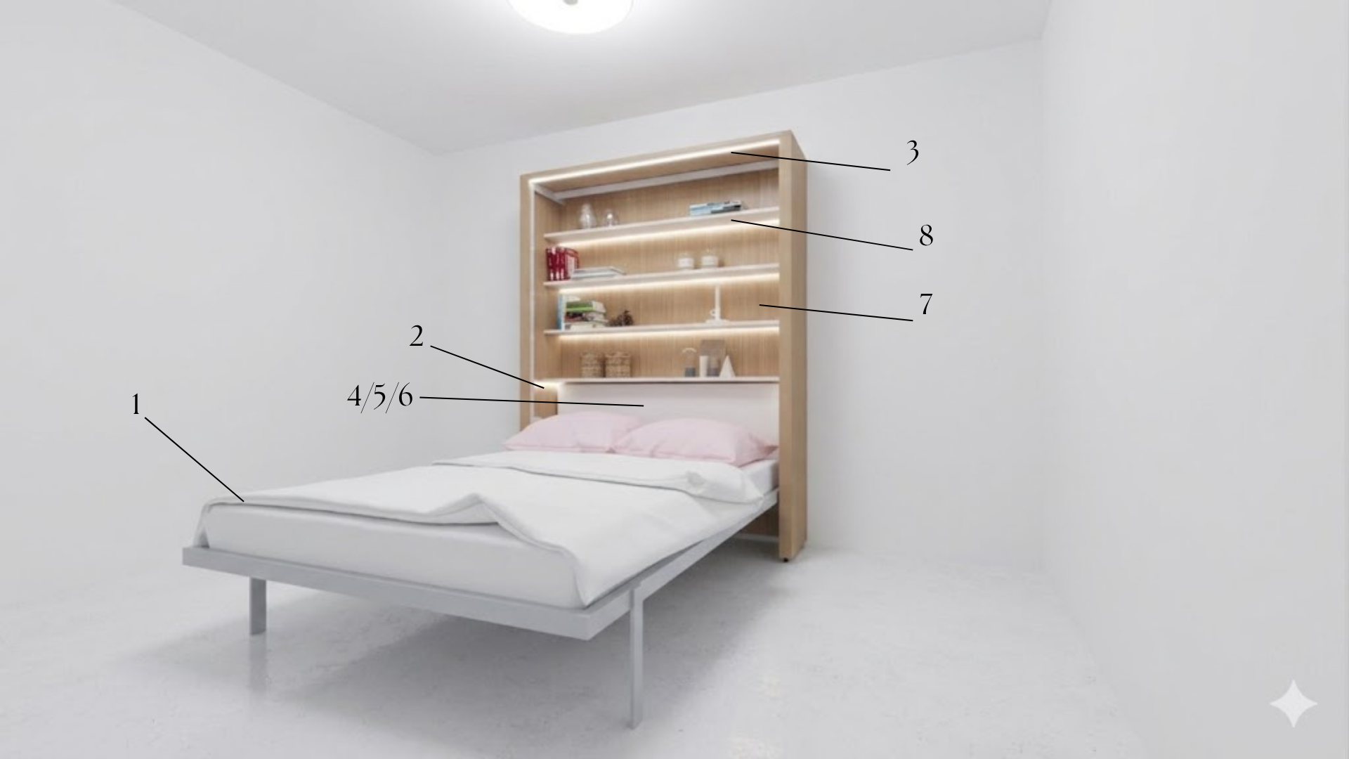 b) Samostojeći zidni krevet (krevet se ne fiksira na zid ili plafon, već ima ploču za stabilizaciju ispred sebe).