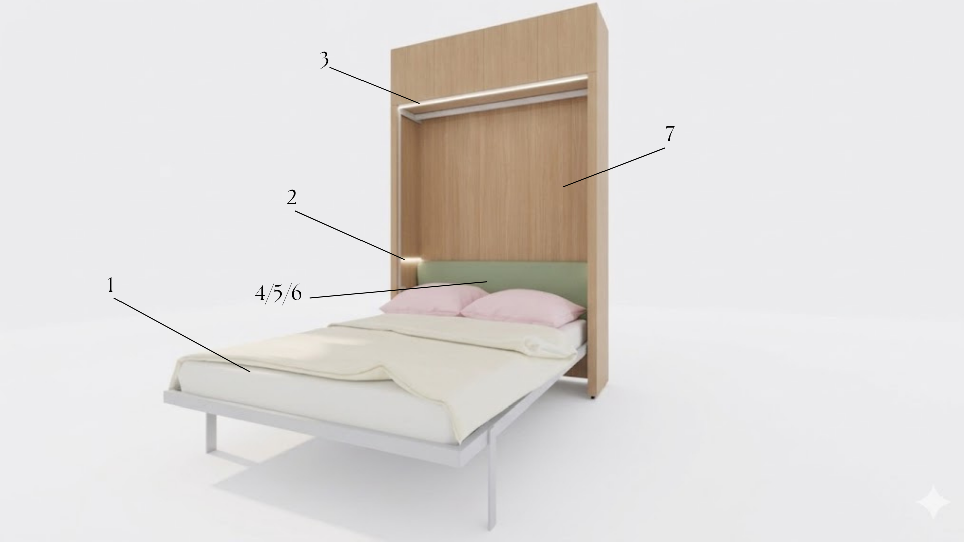 b) Samostojeći zidni krevet (krevet se ne fiksira na zid ili plafon, već ima ploču za stabilizaciju ispred sebe).